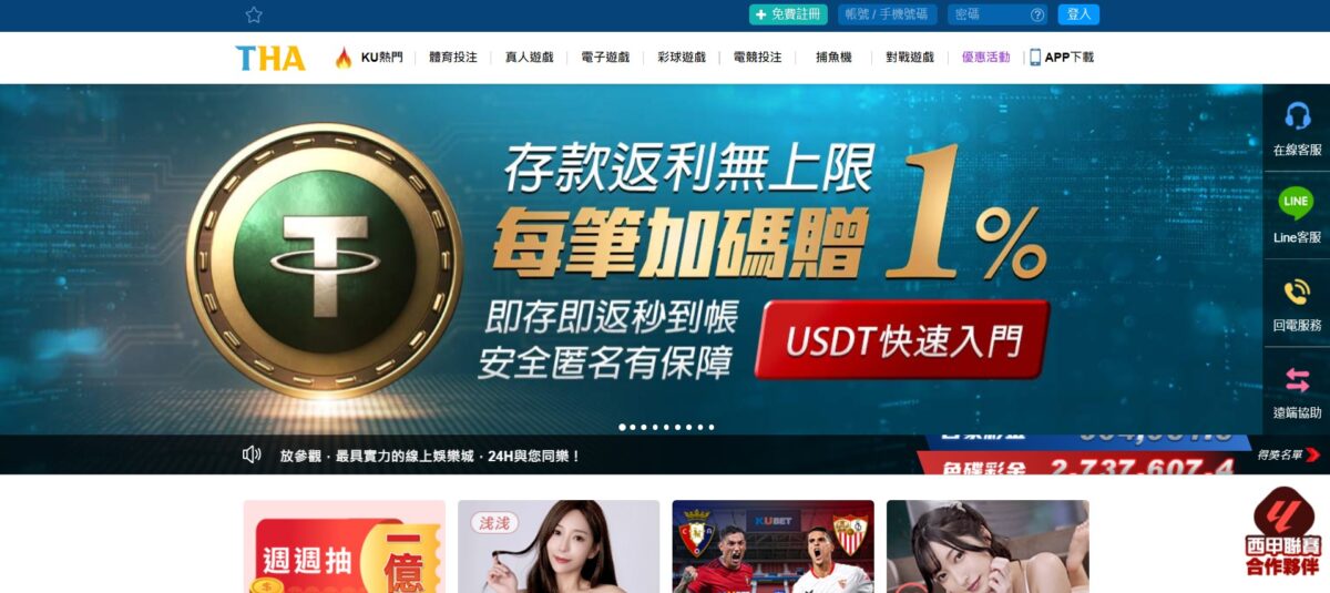 THA娛樂城評價 THA娛樂城為九州娛樂集團旗下的線上娛樂品牌,其提供的遊戲種類繁多,如真人百家樂、輪盤、骰寶,玩運彩、六合彩、超級賓果等。且擁有自有品牌遊戲系統KU體育/真人/電子。而平台的主要優勢在於豐富的優惠活動,如首儲送獎勵和每日返水活動,吸引了許多玩家參與。但部分玩家反應,出金不穩定或出現帳號被鎖的情況,尤其在玩家頻繁贏取大額獎金時。評價為3.8顆星(3.8/5)。 THA娛樂城詳細資訊 賭場名稱:THA娛樂城創立時間:2003年類型:現金型娛樂城遊戲種類:真人百家樂、運彩投注、電子老虎機、六合彩球、棋牌遊戲、捕魚機遊戲軟體下載:支援iOS及Andnoid 存款方式:銀行轉帳、四大超商、虛擬貨幣USDT官網:https://tha58.org/客服方式:24小時線上客服、官方LINE客服、中文語音客服、電子郵件客服、24小時回電服務 官網畫面 遊戲畫面